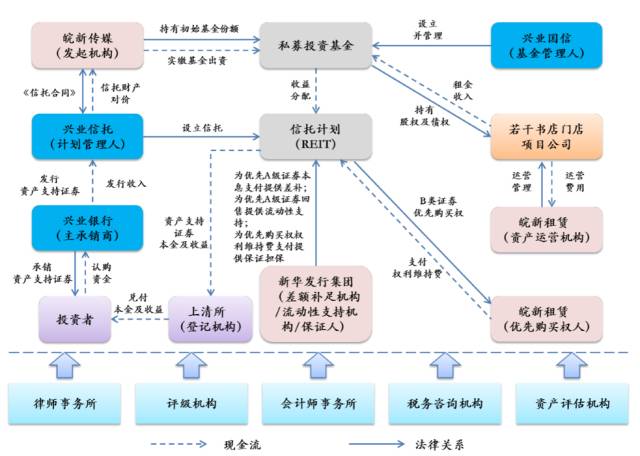 · 由原物业持有人作为股东,通过以标的物业作为资产出资的方式设立项目公司,SPV公司收购项目公司股权,私募基金持有项目公司100%股权。皖新传媒将其持有的私募基金份额作为基础资产以信托的方式交付给兴业信托,由兴业信托在全国银行间债券市场发行资产支持证券。